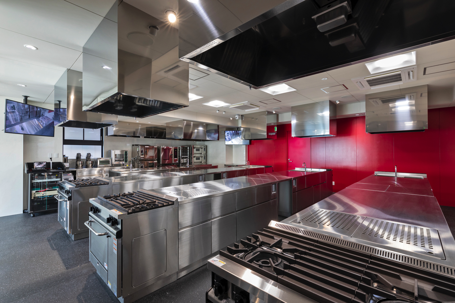 プロの現場の調理機材を備えた本格的な実習室。調理、製菓、製パンの実習やイベント、有名シェフの特別講座などを行います。